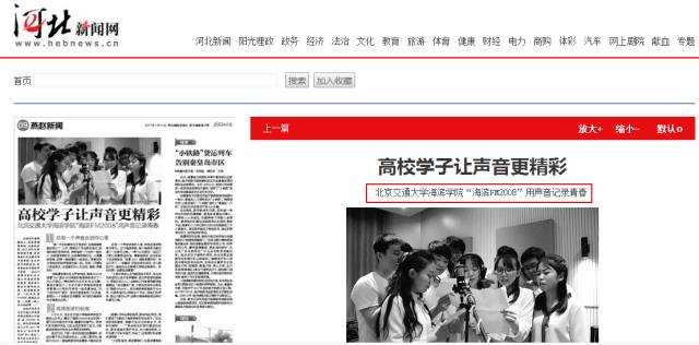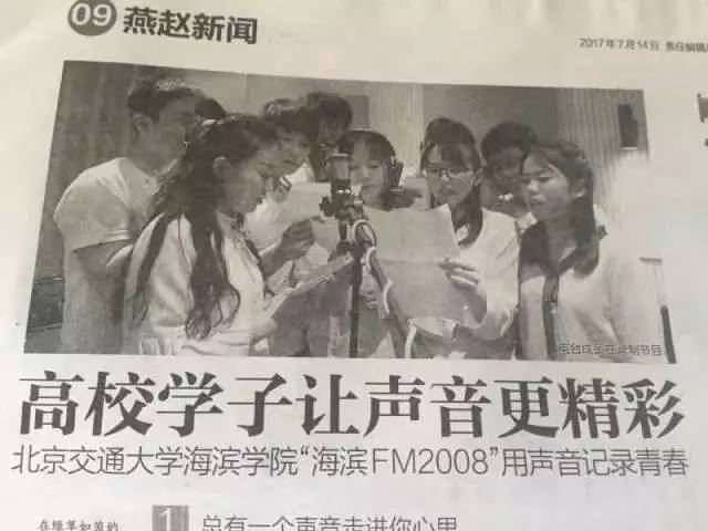 7月14日,由河北省极具影响力的主流强势媒体——《燕赵都市报》大版面刊登《高校学子让声音更精彩——北京交通大学海滨学院“海滨FM2008”用声音记录青春》一文,详细报道了米乐官网全媒体工作室及官方微信平台原创栏目“海滨FM2008”。同时,此文在河北新闻网、青年教育行、《黄骅报》、《渤海新区报》等多家媒体进行转载。