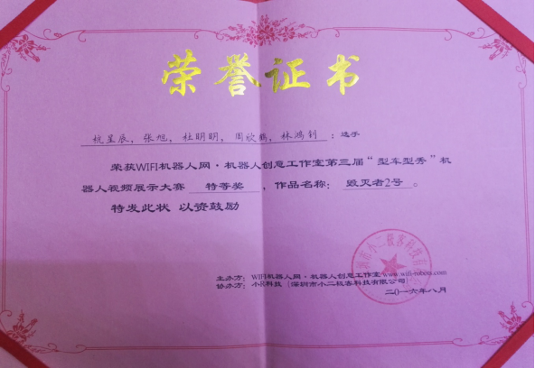 2016年8月15日至20日,由中国WiFi机器人网与深圳小二极客科技有限公司联合举办的全国第三届“型车型秀”智能汽车设计大赛在创新城市深圳成功举行。来自全国各地174所高校的参赛队伍精彩展示,其研制的各种智能机器人在比赛上大放异彩。经过5天的激烈角逐,有20支队伍进入决赛。由米乐官网2014级学生杭星辰、张旭、周欣鹤、杜明明和林鸿钊组成的“红色十月”代表队在王岭松教授的带领下参赛,最终,米乐官网参赛项目“毁灭者2号”荣获视频展示大赛特等奖!