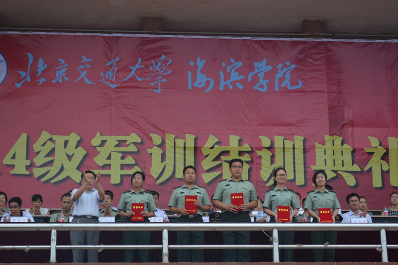 2015年7月16日早7点,我院举行了2014级军训结训典礼。黄骅市市委常委武装部部长庞玉发上校、黄骅市武装部政委李英上校、黄骅港边防检查站副站长史会彬中校,我院全体院领导,北京军区驻北京交通大学选拔培养办公室北京交通大学海滨学院军训团团长倪立萍中校,各系主任助理,各系团委书记,以及军训团各营长、教导员出席典礼。结训典礼由军训团政委、院团委书记黄璐璐主持。