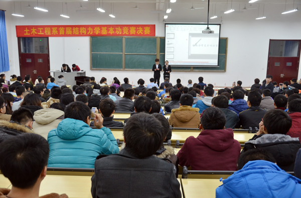 12月6日晚七点,土木工程系首届结构力学基本功竞赛决赛在思源楼225教室开赛。经过初赛和半决赛的层层选拔,8名选手从165名参赛同学中脱颖而出晋级决赛。土木工程系主任陈凡丁以及时国松、董军、李杰、许秀颖、王轶霞、张芳源、杜志超、尹迪、杨中建老师担任决赛评委。结构力学学生讲堂2010级主讲人王超、2011级主讲人周俊波、李亚飞、徐颖、杨德超担任决赛嘉宾。土木工程系各年级同学观摩比赛。