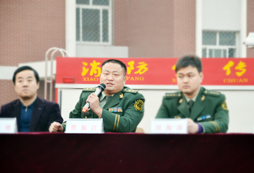 会上,曹振江大队长讲话,呼吁我院师生增强消防安全意识,掌握必要的消防自救知识。