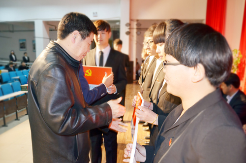 会上,全体师生党员自行佩戴党员党徽,并集体面对党旗宣誓,重温入党誓词。