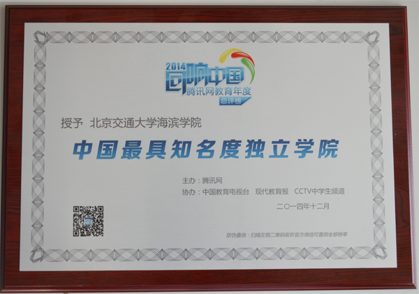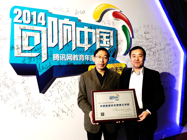 12月3日下午,由腾讯网主办,中国教育电视台等单位协办的2014“回响中国”腾讯网教育年度总评榜荣耀盛典在京举行。经过网友投票和专家评审等环节,我院荣膺“中国最具知名度独立学院”。