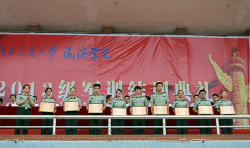 会上,孙文博副书记宣读了《北京交通大学海滨学院2013级军训表彰决定》,与会领导及相关单位负责人分别为军训获奖集体和个人颁奖。