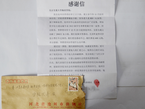 据了解,2013年11月,王立新的父亲因病住院,急需输血小板,老人是RH-A血型,该血型属于稀缺血型。沧州市中心血站随即面向社会广泛征集,发现我院学生李烨青与老人血型一致。李烨青同学得知老人需要输血的消息后,于12月23日自费打车赶到沧州市,无偿为老人献了200CC血小板,此举令王立新全家非常感动。