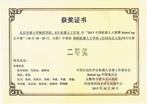 这是我院代表队第二次参加中国机器人大赛暨RoboCup公开赛并获奖。在2012中国机器人大赛暨RoboCup公开赛舞蹈机器人大学组(自创双足人形)比赛中,我院代表队荣获全国一等奖,并以全国第三名的优异成绩夺得季军奖杯。对于2013中国机器人大赛,院系两级领导高度重视、大力支持,专门安排代伟业老师和杨树岗老师指导学生参加比赛,ET机器人工作室11名队员精心准备,全力备战。最终,在众多一本二本高校优秀选手参赛的情况下,作为三本层次的独立学院,我院代表队在激烈竞争中脱颖而出,取得喜人成绩,受到大赛评委的一致认可。