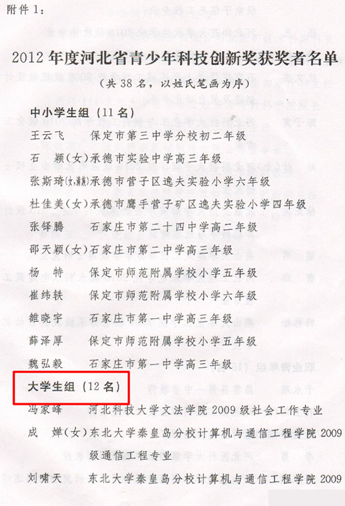 近日,在团省委、省科技厅联合开展的2012年度“河北省青少年科技创新奖”评选活动中,我院计算机科学系计算机科学与技术专业2010级学生徐正夫喜获“河北省青少年科技创新奖”。