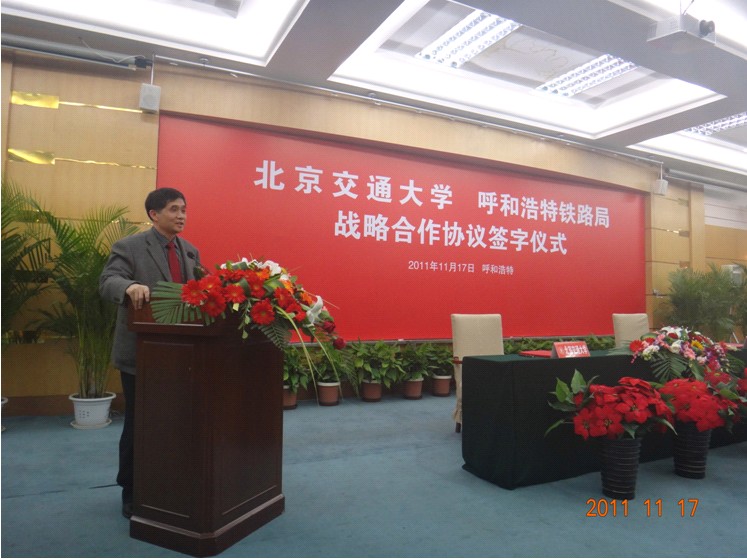 在签字仪式上,宁滨校长首先对呼和浩特铁路局多年来支持学校人才培养、科学研究、学科建设表示感谢。宁滨校长指出,北京交通大学与呼和浩特铁路局有着良好的合作基础,在铁路科学发展的大背景下,希望双方进一步加强合作,在人才培养、战略规划研究、重载运输技术进步等方面密切合作,为我国铁路事业、教育事业做出贡献。