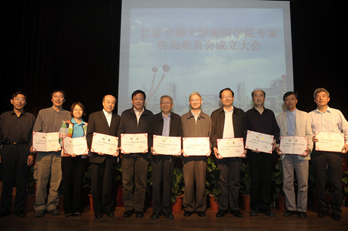大会在雄壮的《国歌》声中拉开帷幕,王院长首先介绍了参会领导和与会人员,党委书记张平之宣读成立专家咨询委员会的决定。随后,高院长介绍首批委员学术背景情况,我院本次共聘请了12位学术造诣精深的专家学者加盟专家咨询委员会,为我院的发展出谋献策。其中,原北京交通大学校长谈振辉教授任专家咨询委员会主任委员,高福廷院长任副主任委员,王金华教授、宋守信教授、查建中教授、阮秋琦教授、夏禾教授、常工教授、肖贵平教授、王立德教授、张文松教授、卢苇教授和谢基龙教授被聘任为委员,叶斌教授为秘书长。高院长为以上委员颁发了聘书,谈教授代表委员们表示一定尽心尽力为学院发展献计,不辱使命。