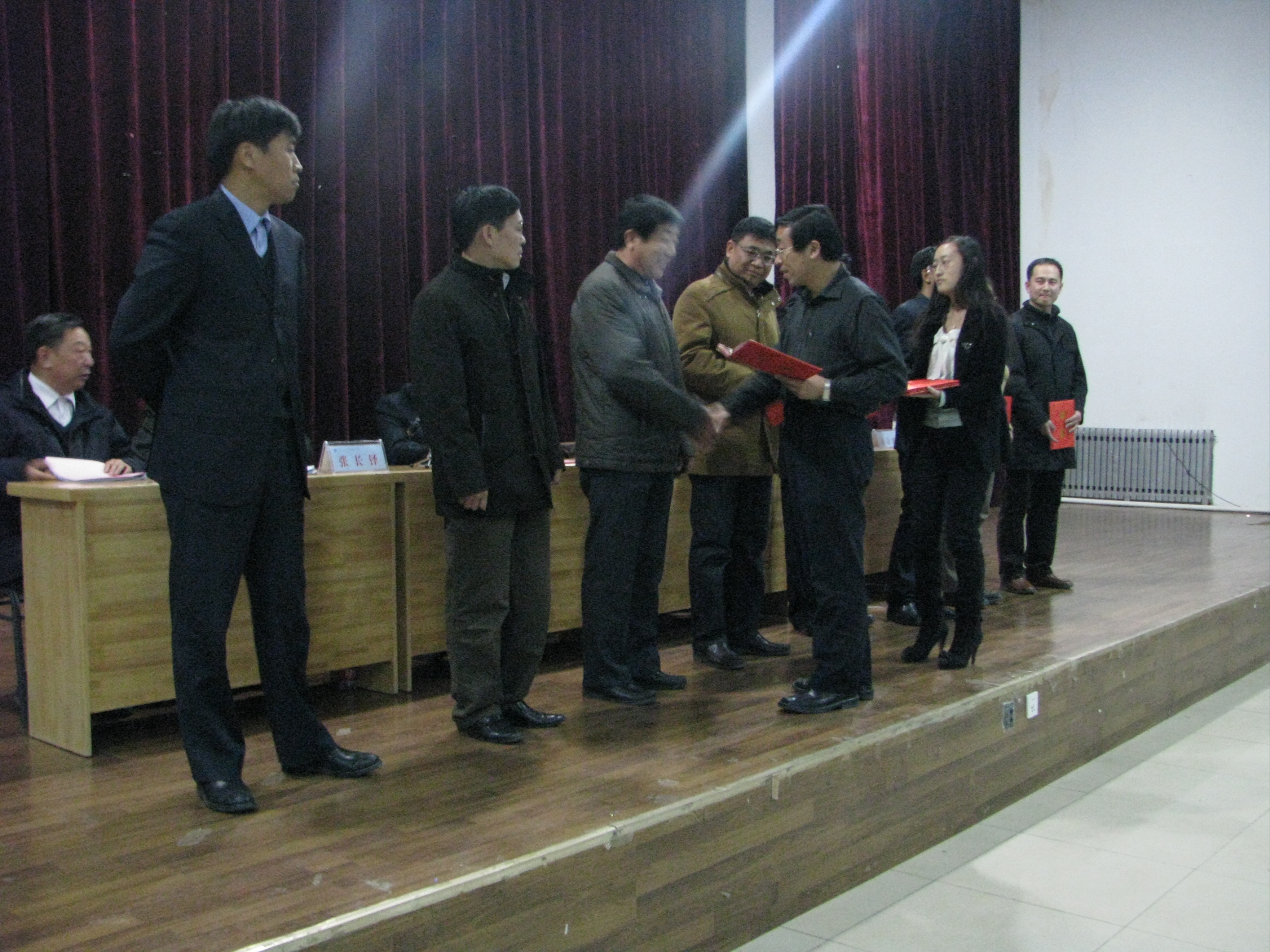 随后,高福廷院长为新任命的学院办公室主任任福义、教务处处长刘燕、学生处处长王友双、招生就业处处长冯宝玺、计财处处长巫建德、后勤管理处处长王炳礼、信息中心主任赵广顺、图书馆馆长李京涛8位部门正职干部颁发了聘任证书,并与他们合影留念。