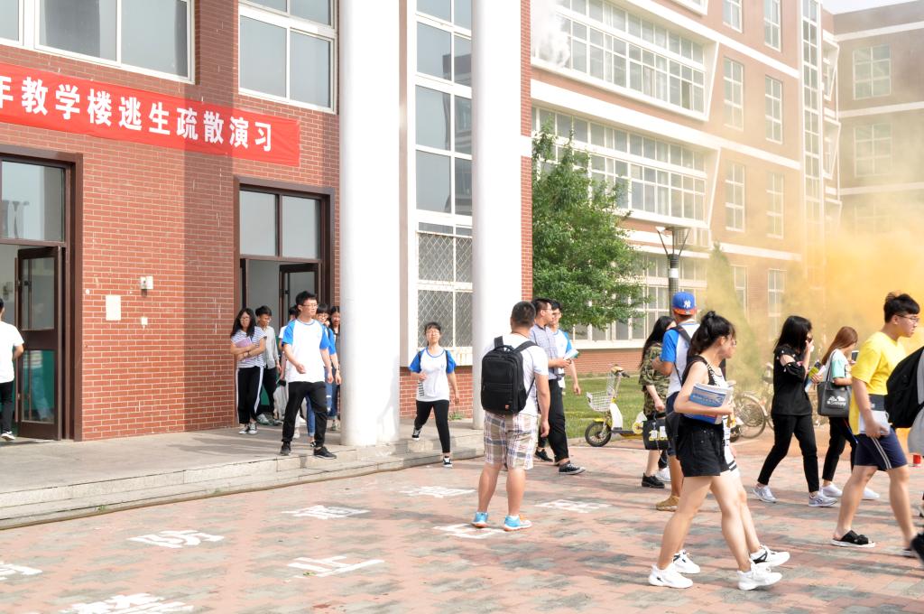 演习由魏炜副书记宣布开始,演练中,模拟通方楼三楼发生“火灾”后,火势迅速蔓延,烟雾向四周不断扩散,正在上课的学生在教师指挥下开始紧急疏散,按照逃生路线有组织地安全撤离起火教学楼到安全地带。整个疏散演练过程安全、迅速、有序,所有师生用时1分30秒疏散完毕,并在西侧广场集合。