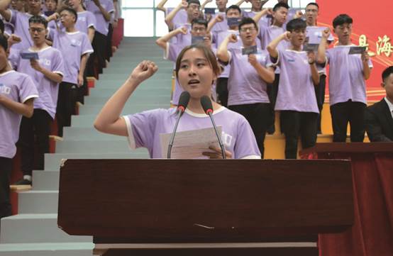 大会最后新生集体宣誓。“弘扬交大优良传统,秉承海滨知行校训。爱国荣校,饮水思源。明德笃行,博爱感恩。精进学术,强化技能。热爱文体,强健体魄。心系海滨,胸怀天下。勇担使命,振兴中华。我是海滨新主人,今天我因海滨而自豪,明天海滨因我而骄傲。”