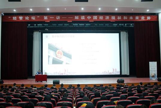 为加强米乐官网经济管理学院学生对中国经济形势的了解,提高学生在经济、金融领域的学习认知程度,3月28日下午,米乐官网经济管理学院主办,金融工程专业承办的 “经管论坛”系列讲座活动在天佑会堂顺利举行。本次论坛邀请到黄骅市政协主席(原黄骅市常务副市长)贾兆德担任主讲人,做了以“解读中国经济状况与未来走势”为主题的指导讲座。经济管理学院全体教师、1000多名学生和部分企业家代表参加了本次讲座。讲座由金融工程专业负责人周强教授主持。