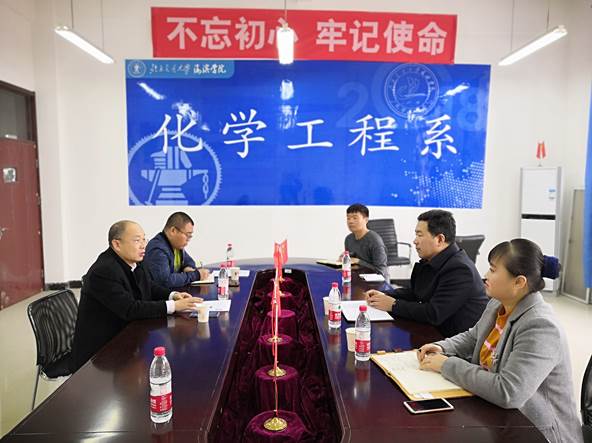 2019年4月11日下午,沧州渤海新区医药行业协会李玉波秘书长与公共服务运营平台孙晨晓主任来米乐官网化学工程系商议进一步合作洽谈事宜。系主任郑辉杰、副主任孙丽以及相关负责老师参加了此次洽谈工作。