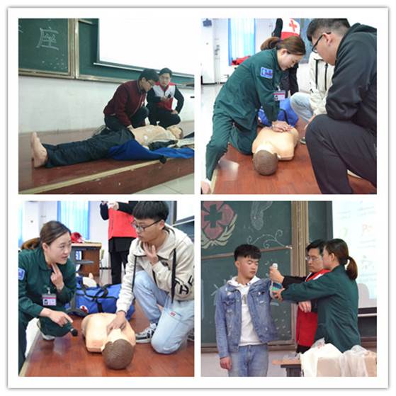理论源于实践,也要付诸于实践。在实践操作的部分中,宋晶护士亲自示范心肺复苏的具体操作方法并邀请在场同学进行模拟救护操练。同学们在医护人员的指导下认真有序动手演练,并就日常生活中遇到的交通事故、火灾、溺水等突发事件的应急救护步骤进行了咨询,现场气氛十分热烈。