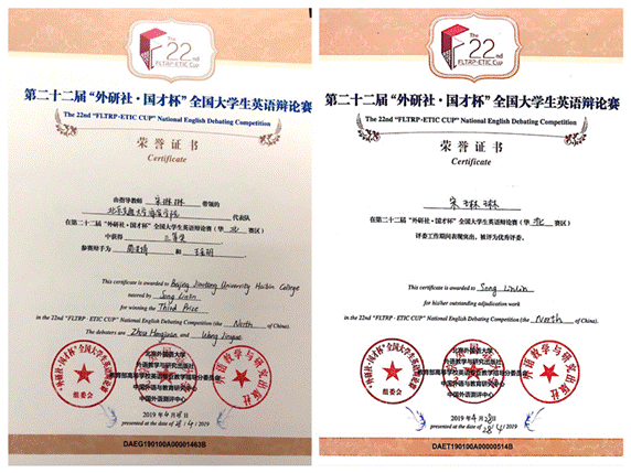 本次比赛包括五轮循环赛和一轮总决赛,辩题发布后辩手需在15分钟内组织观点语言进行7分钟的全英发言。在严格的比赛规则下赛场氛围激烈沸腾,赛场上辩手互不相让,即使赛场上不乏有来自于清华大学、北京外国语大学等一流名校的辩手,米乐官网选手冷静应对,以专业的技巧方法完成本次比赛。最终米乐官网选手荣获华北赛区三等奖,带队教师宋琳琳被评为优秀评委。