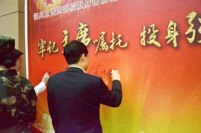 黄骅市市长宋忠秋从适应现代战争新形势,实现强军目标、保家卫国,建设强大国防、建功军营,实现人生价值三个方面阐述了征兵宣传进高校的目的与意义,他讲到,当代大学生要把自己的爱国之心化为报国之心,在军队的大舞台上施展才华,在军营的大熔炉里,淬炼成钢,书写绚烂无悔的青春篇章。应征参军不仅是每个人的神圣义务,更是一次脱胎换骨,重塑自我的报国之路。