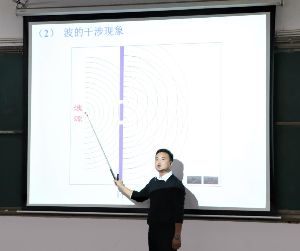 基础教学部教师丛红璐从“波的干涉”基本理念讲起,循循善诱,用亲切的语气为同学们讲解基本公式,在幻灯片中加入生动形象的动画帮助同学加深概念,以“弹吉他”“摇跳绳”来解释生活中出现的驻波现象,并准备专业实验仪器亲自演示“鱼洗盆”共振原理的模拟实验,使学生更好地掌握此次课堂的专业知识。