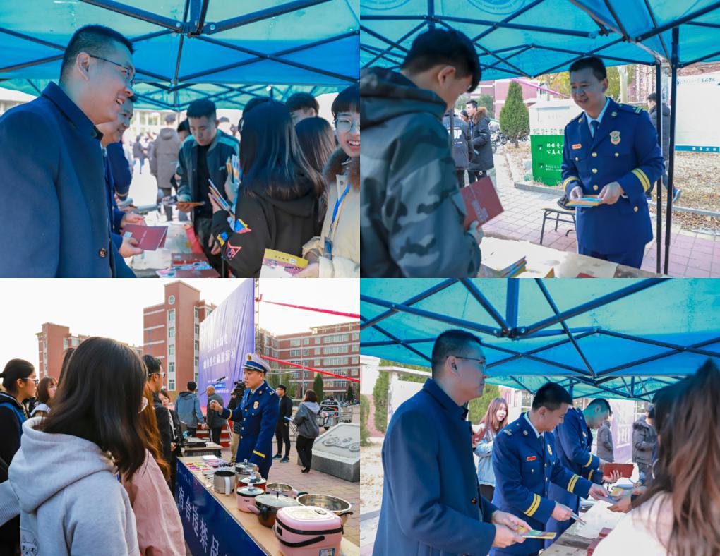黄骅市消防大队人员为学生讲解宿舍违禁品的危害,并派发消防安全宣传册