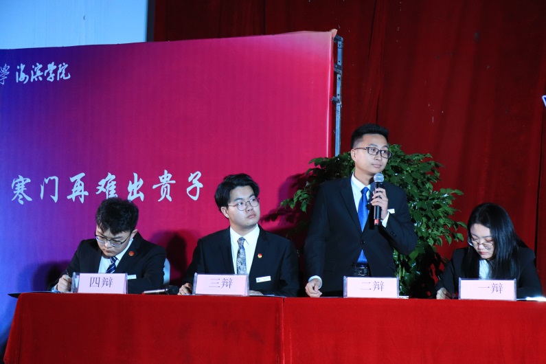 冠亚争夺赛中,正方辩手电子与电气工程学院代表与反方辩手外国语学院代表,对“寒门是否难出贵子”进行辩论。正方以寒门学子实现贵子的努力程度大于非寒门学子,反方以阶级的不同从而实现贵子的目标水平不同,两个方面展开辩论。正反双方你来我往、唇枪舌战,现场高潮迭起、掌声不断。