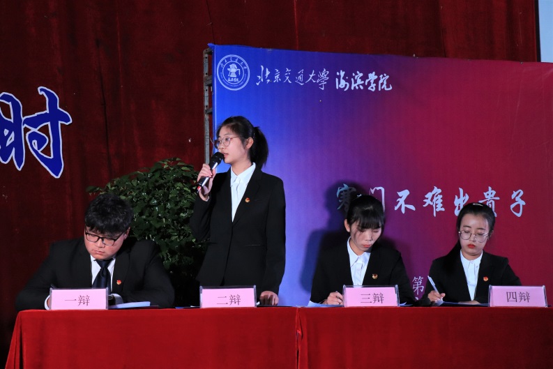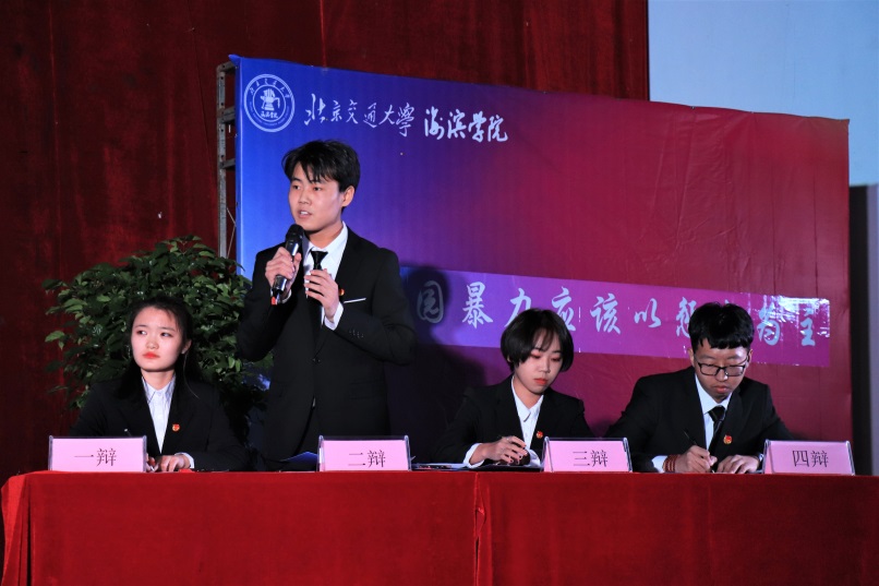 季军争夺赛中,正方辩手土木建筑工程学院代表队与反方辩手计算机与信息技术学院代表队,对“治理校园暴力应以教育为主还是惩戒为主”的辩题进行辩论,双方各执一词,对现有的热门现象——校园暴力,展开激烈争辩。双方选手在立论、驳立论等各个环节中思路清晰,字字珠玑,现场气氛迅速升温。在自由辩论环节中,双方选手就辩题展开更深层次的辩论,将比赛推向高潮。