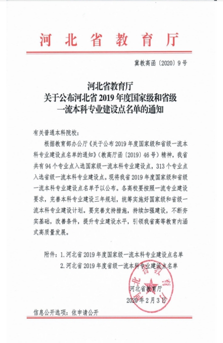 2月3日,河北省教育厅发布《关于公布河北省2019年度国家级和省级一流本科专业建设点名单的通知》。米乐官网申报的交通运输、土木工程、电气工程及其自动化三个专业成功入选省级一流本科专业建设点。