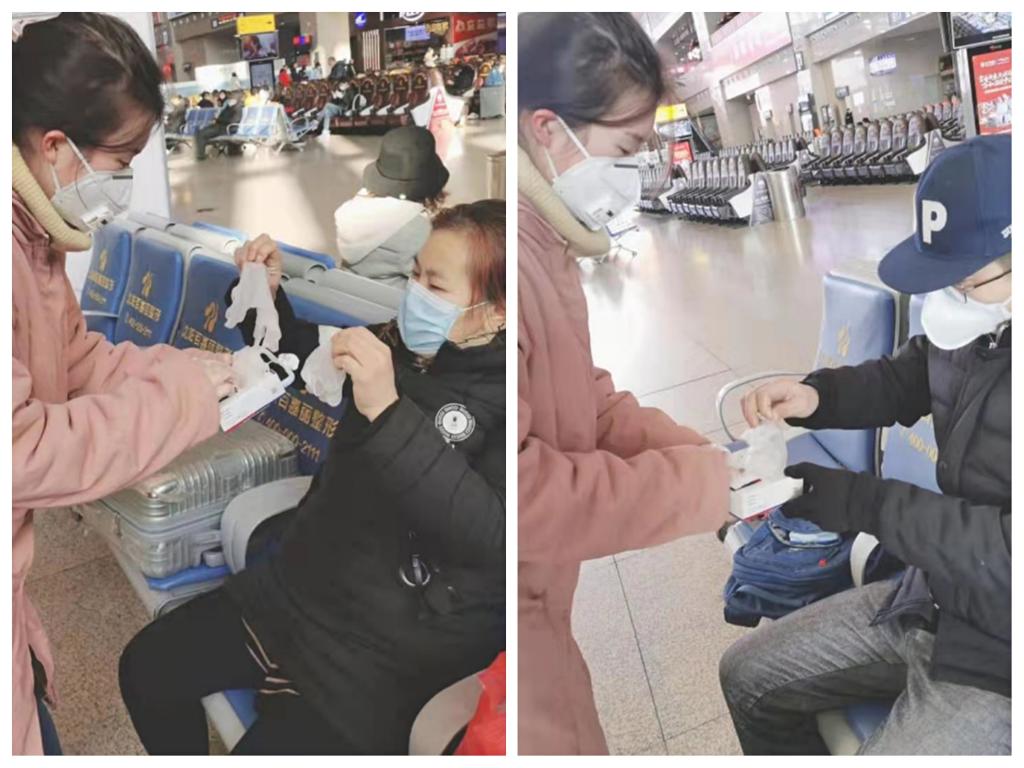 她提前去药店购买了大量的口罩和手套,在候车室送给那些回家的旅客,同时,还会向他们讲解一些基本的防疫知识,为旅客的安全增添保障。