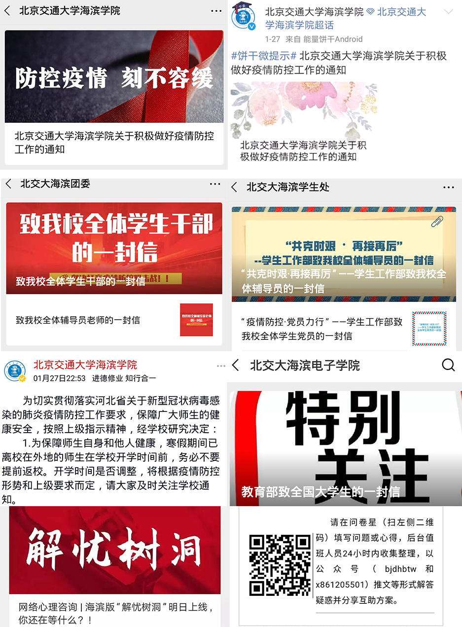 米乐官网建立疫情信息报告体系,对全校教职员工的出行及身体、生活情况进行摸排,并通过校园网、微信、微博、师生群等多种渠道,开展有效的疫情防控教育,引导师生做好自我防护,科学理性认识疫情,不信谣、不传谣,积极完成网络课程的“教”与“学”。学生处面向全校学生开展网络心理咨询服务,保证学生情绪稳定,维护学生心理健康。