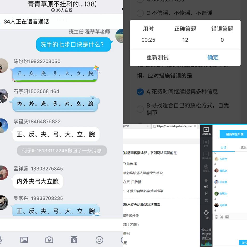 为增强学习效果,本次培训采用线上会议和线下个人回顾学习相结合的方式,通过线上小测试帮助师生进一步掌握相关知识,引导学生正确认识新冠肺炎,做到防治结合、科学防护、理性应对。