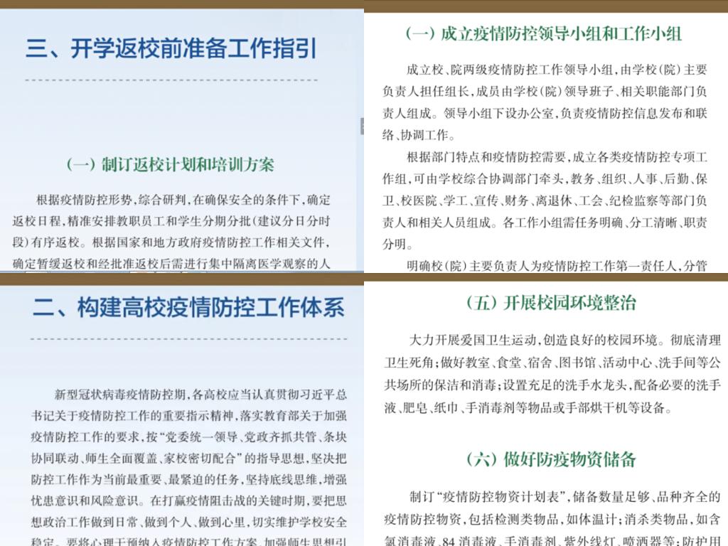 2、各高校要加强组织领导,建立联动机制,推进工作落实,对于高校防控工体体系成立专门的防控小组并制定方案;对开学返校前需要准备的工作做工作部署,包括:制定返校方案计划、监测摸排、加强校园安全保障、物资储备等。