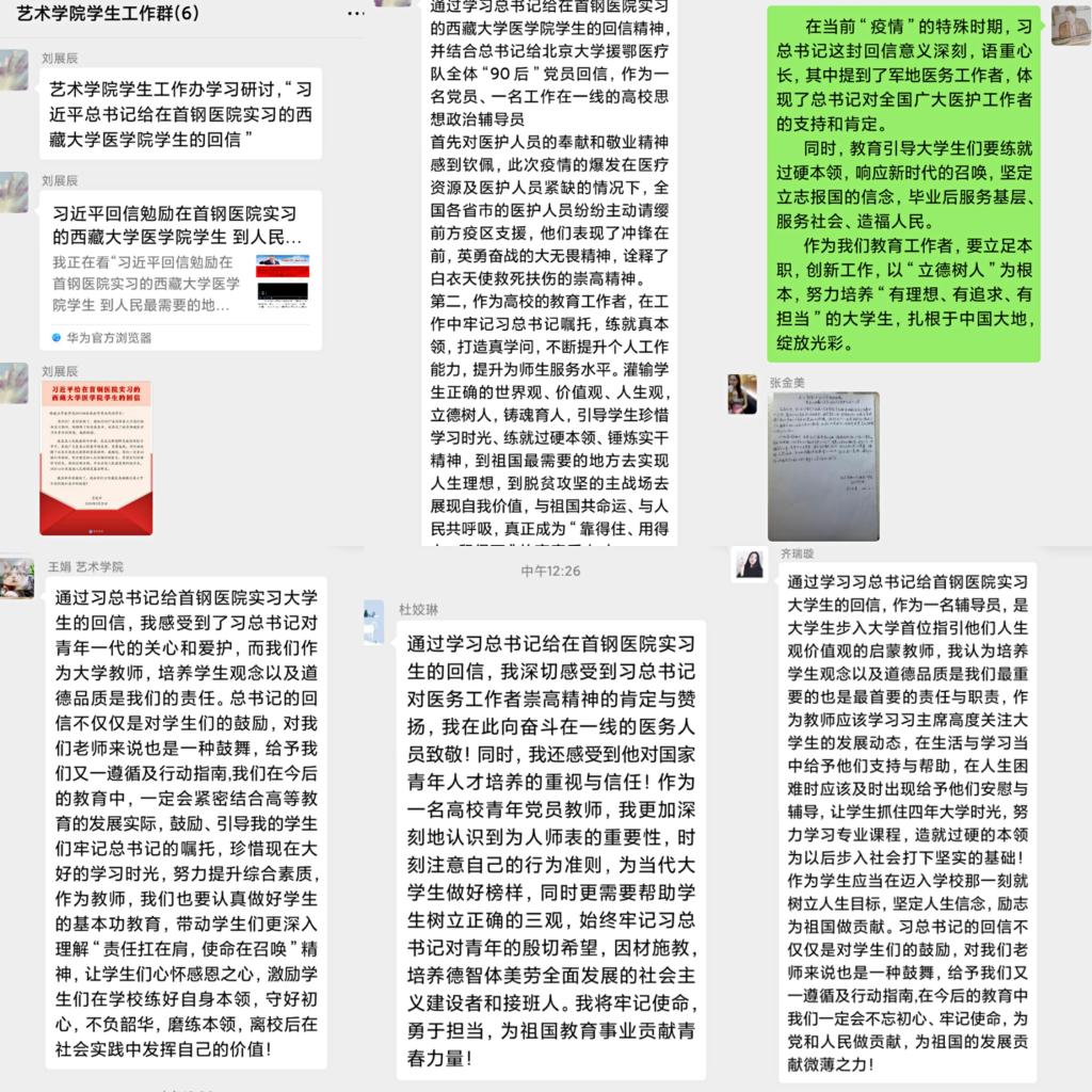 习近平总书记给正在北京大学首钢医院实习的西藏大学医学院学生回信,向他们和奋斗在疫情防控阻击战线上的广大青年致以诚挚的问候,回信引发了强烈反响。米乐官网艺术学院各个部门以高度的政治自觉、思想自觉和行动自觉,充分利用微信平台,加强宣传教育引导,真正把习近平总书记的关怀和期望快速有效地传递到学院广大师生群体中,迅速掀起了学习宣传习近平总书记重要回信精神的热潮。
