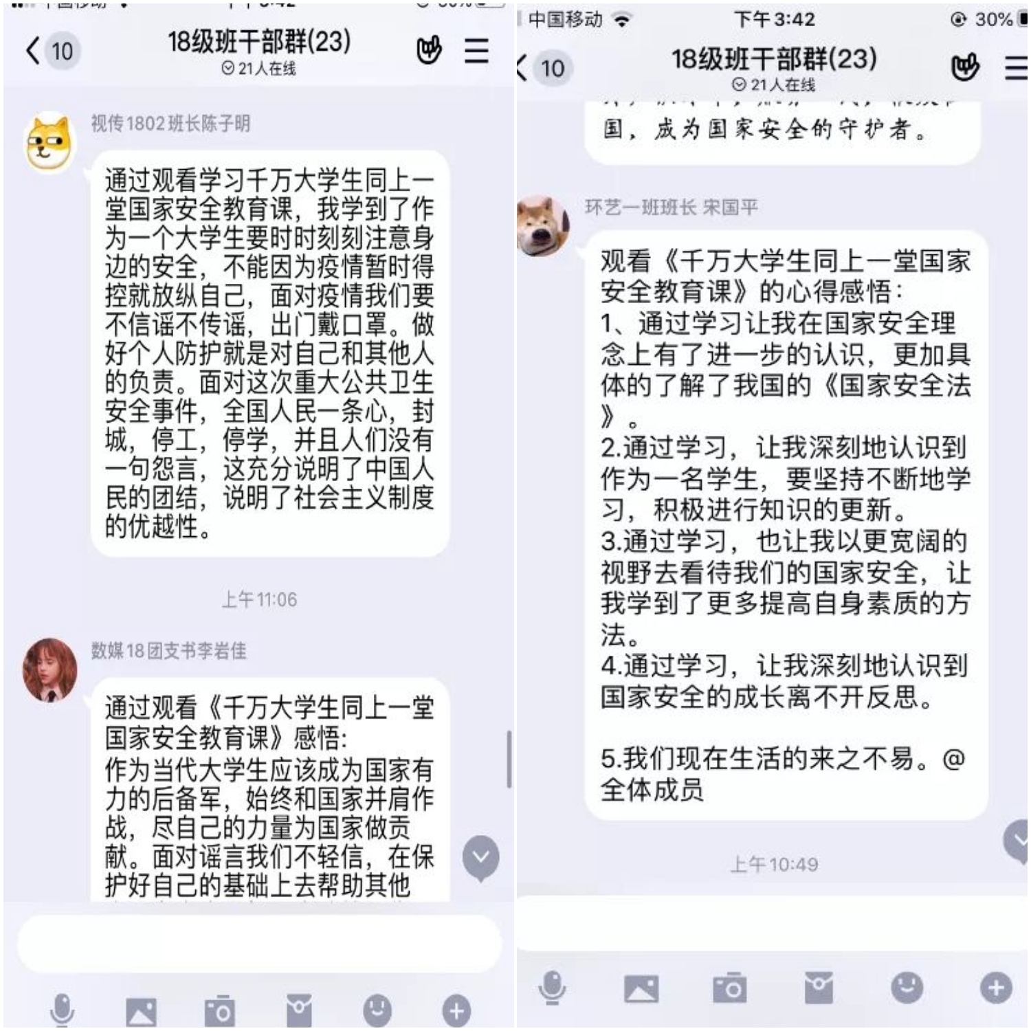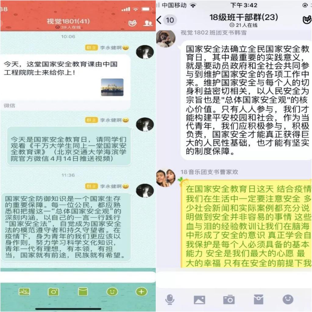 4月15日是国家安全教育日,为培养和增强当代大学生自觉维护国家安全的责任感和使命感,进一步增强大学生维护国家安全的意识。米乐官网艺术学院组织各班级、班干部通过群组讨论的方式线上观看《千万大学生同上一堂国家安全教育课》,并进行交流发表各自感悟。