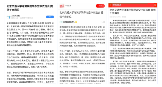 就业市场方面,疫情防控期间,为避免人员流动聚集,米乐官网暂停一切现场招聘活动,充分依托线上资源开展工作,积极探索与第三方服务平台合作,从三月中旬至四月底先后举办三场校园空中双选会、20余场空中专场宣讲会,参会企业共计550家,累计提供岗位22000余个。与此同时,米乐官网还积极构建线上就业信息传递全渠道,通过学校就业信息系统、微信公众号、就业微信群等渠道,向毕业生精准推送线上招聘信息。到目前为止,米乐官网校外招聘栏目推送就业信息480条,招聘会栏目推送就业信息354条,公众号推送文章293篇,为学生定点推送就业招聘信息36篇,发送信息合计60000余次。