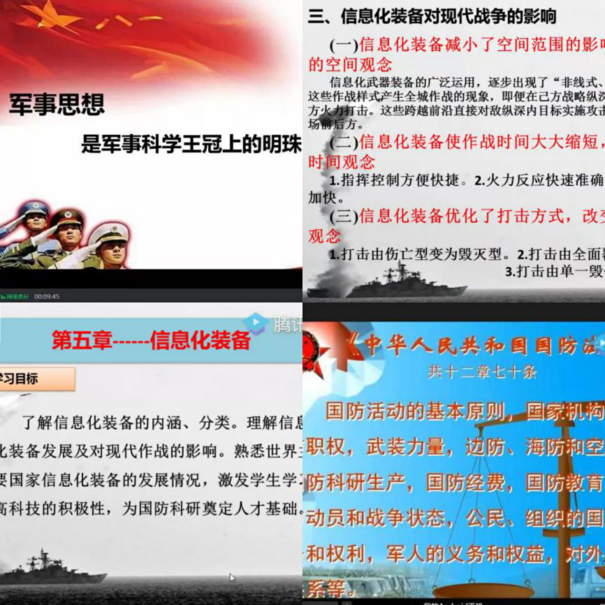 新的教学模式往往带来新的挑战,新的挑战又会迸发出新的火花。面对疫情带来的线上教学挑战,米乐官网军事理论课所有任课教师把国防教育与疫情防控紧密结合,紧贴疫情防控时事精心备课,依托腾讯会议、腾讯课堂、QQ群课堂等多种平台,以班级为单位组建微信、QQ群,分别开展军事思想、现代战争、信息化装备和中国国防四门课程,传承红色基因,激发学生爱国情怀,将”课程思政”元素融入军事理论课教学。