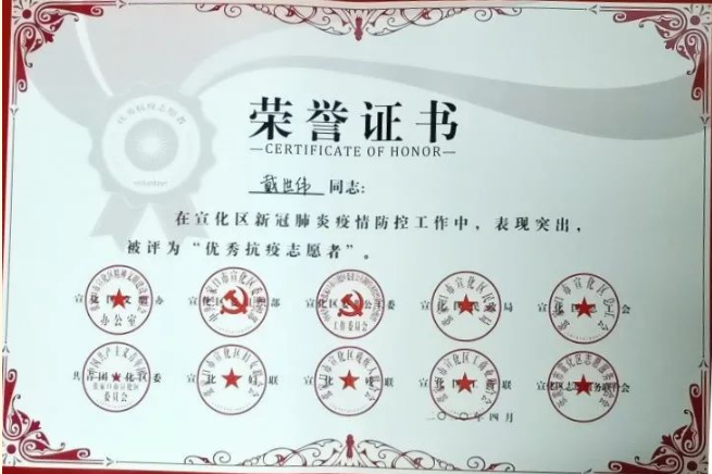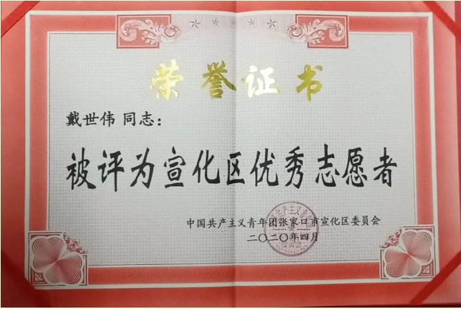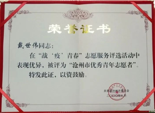 为弘扬和培育“奉献、友爱、互助、进步”的志愿精神,表彰在抗击疫情期间做出突出贡献的优秀志愿者,共青团沧州市委员会在全市范围内开展“战‘疫’青春”志愿服务先进典型评选活动。米乐官网土木建筑工程学院工程造价专业1802班学生戴世伟被授予“沧州市优秀青年志愿者”荣誉称号。