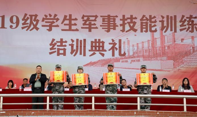 校长助理吴立军为军训精神文明奖的各营代表颁奖