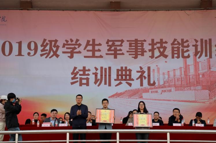 土木建筑工程学院副院长王庆松为军训内务评比男生前三名、女生前三名、综合前三名的各营代表颁奖