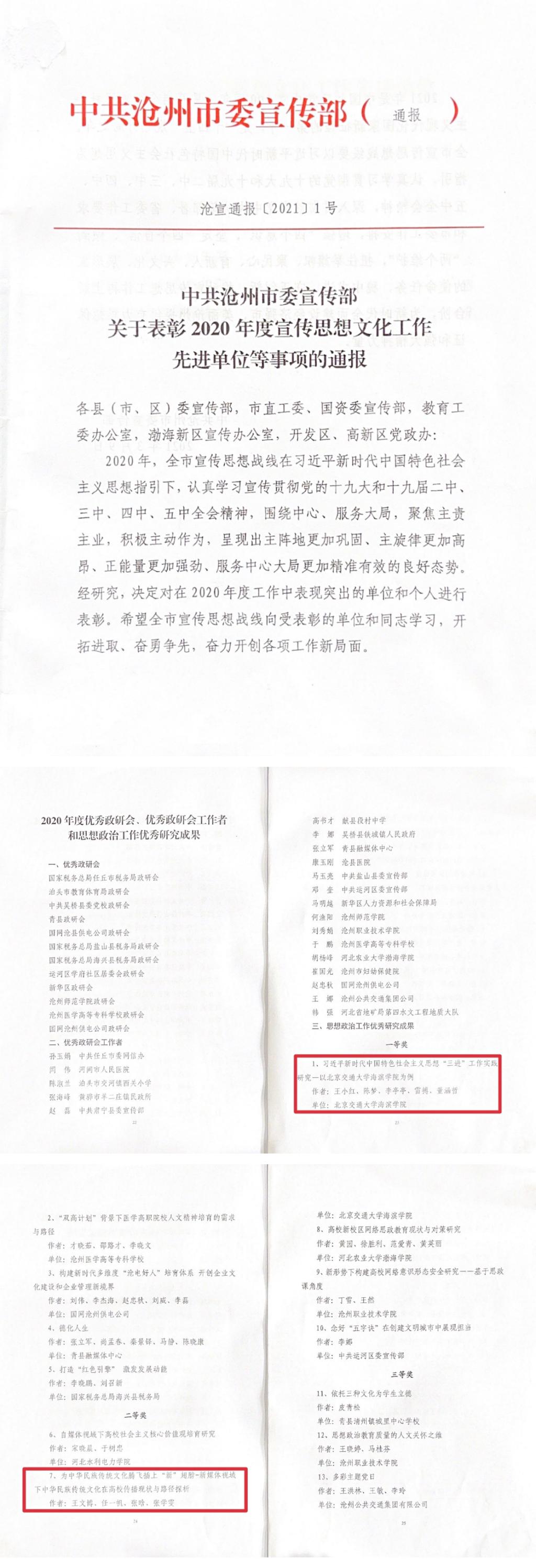 近日,中共沧州市委宣传部下发《关于表彰2020年度宣传思想文化工作先进单位等事项的通报》,公布沧州市2020年度思想政治工作研究成果评选结果,米乐官网荣获一等奖和二等奖各一项。