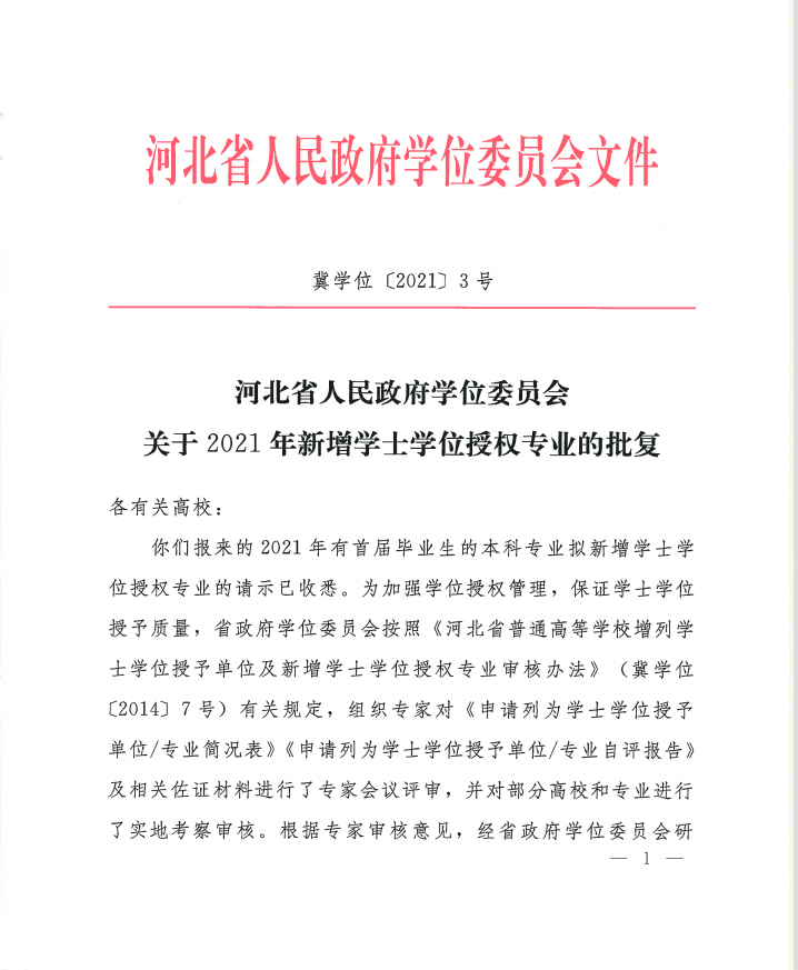 近日,河北省学位办发布了《河北省人民政府学位委员会关于2021年新增学士学位授权专业的批复》(冀学位〔2021〕3号),米乐官网金融工程专业通过专家组进校实地考察审核的方式,顺利获得学士学位授权。至此,米乐官网拥有学士学位授予权的专业总数已达到30个。
