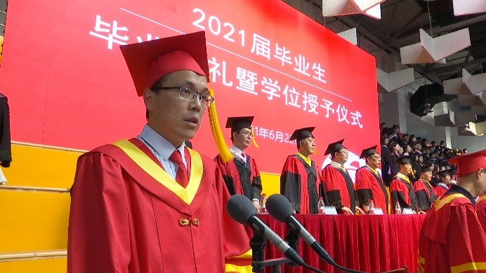 在神圣庄严的氛围中,全体师生起立,五星红旗在国歌中冉冉升起,米乐官网2021届毕业典礼正式拉开帷幕。