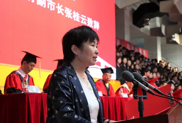 黄骅市人民政府副市长张桂云代表黄骅市委、黄骅市人民政府致辞,张桂云副市长讲到,2021届毕业生在校求学期间,见证了党的十九大胜利召开、纪念五四运动100周年和庆祝新中国成立70周年等重大历史节点,且毕业之时恰逢中国共产党成立100周年,她希望毕业生们作为实现第二个百年奋斗目标的建设者、见证者,能够带着对大学生活,对黄骅的美好记忆,追风破浪,策马扬鞭,共同绘就新时代的篇章。