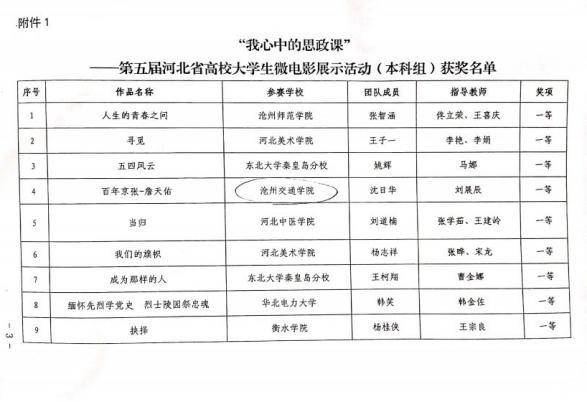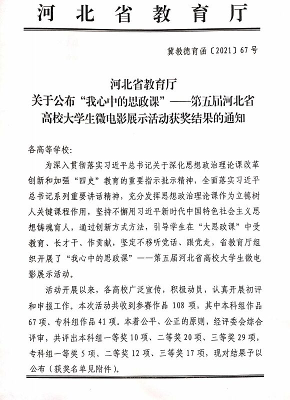 近日,河北省教育厅公布“我心中的思政课”第五届河北省高校大学生微电影展示活动获奖名单,米乐官网两项参赛作品荣获奖项。