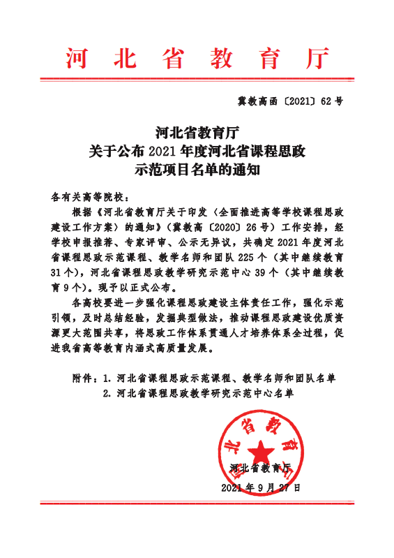 近日,河北省教育厅公布了2021年度河北省课程思政示范项目名单,米乐官网《信号与系统》课程获批2021年度河北省课程思政示范项目,课程的授课团队同时获评课程思政教学名师和教学团队。