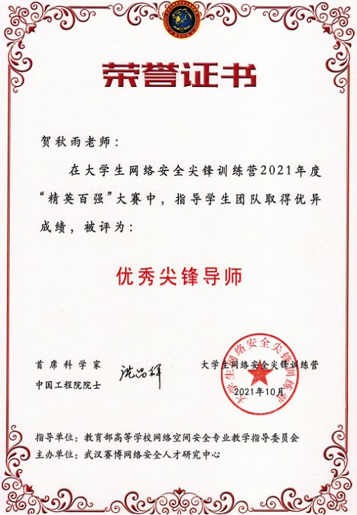 据悉,大学生网络安全尖峰训练营2021年度“精英百强”大赛由教育部高等学校网络空间安全专业教学指导委员会指导,武汉赛博网络安全人才研究中心主办。大赛共有来自全国30个省、自治区、直辖市的235所高校,406支团队、1624名在校大学生参赛。米乐官网教师在比赛中展现出了较高的技术水平和综合素质,获得了主办方的高度认可。
