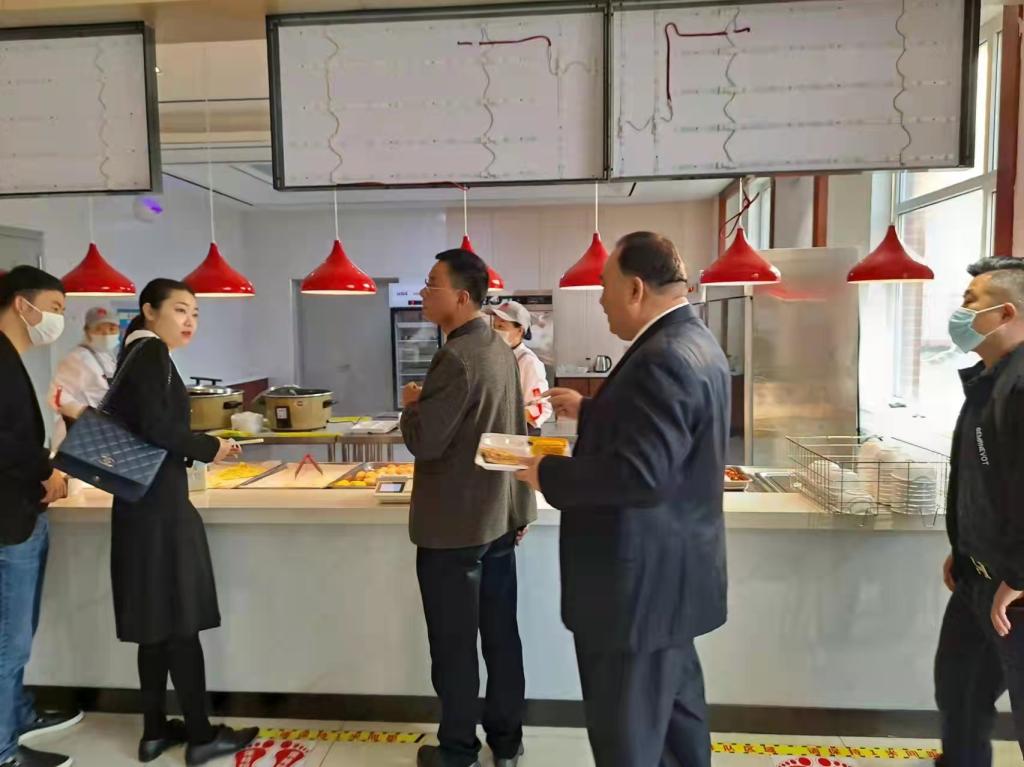 薛董事长一行首先视察了教工食堂,他就食堂环境卫生、食品安全、服务态度以及饭菜质量、价格等方面进行了详细了解,并与教师一同就餐,亲身体验师生就餐环境。