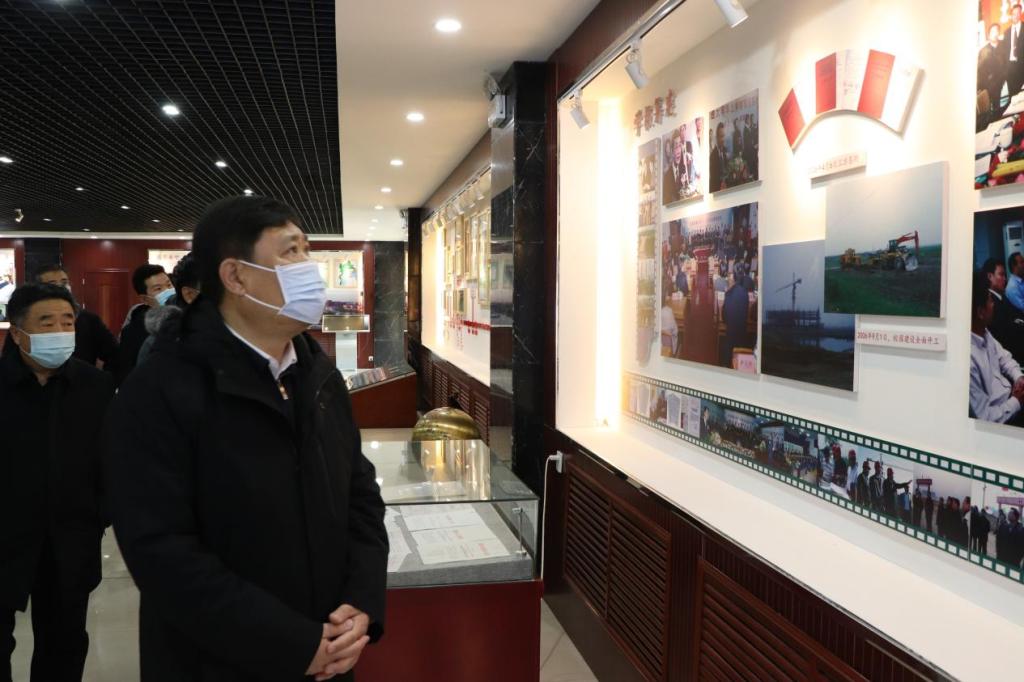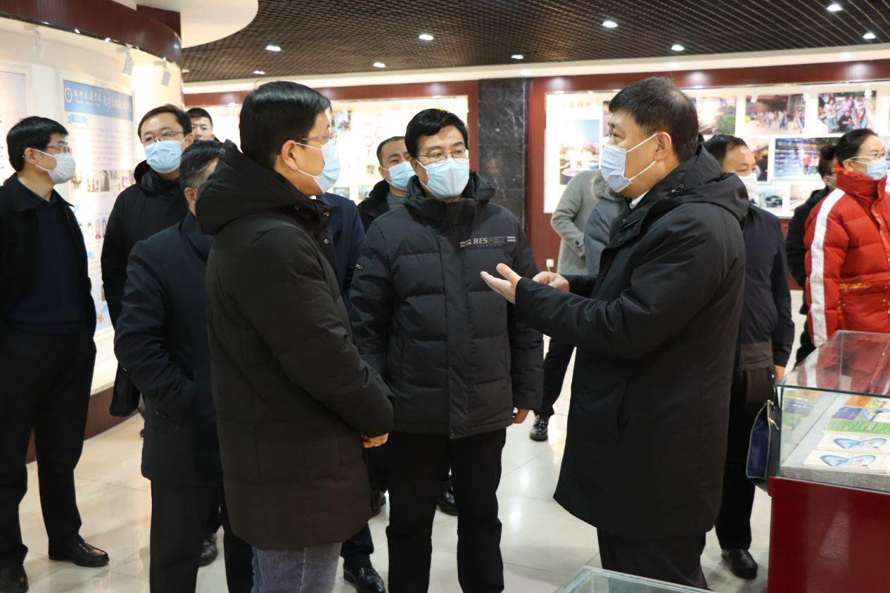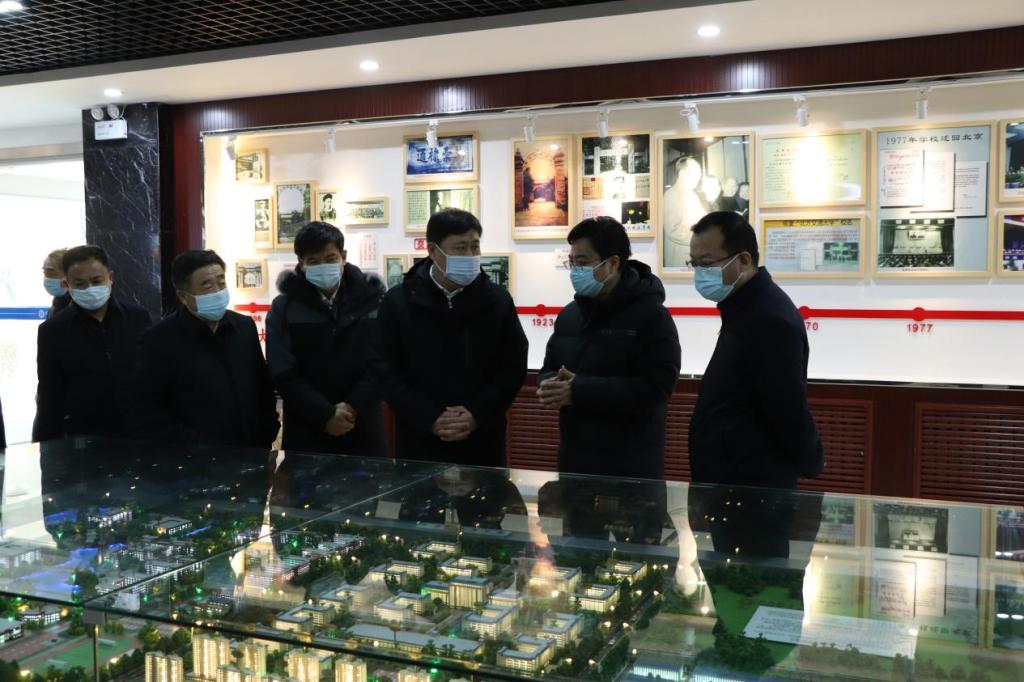 张力校长陪同戴副市长考察整体校园布局,并沿路介绍校园情况,随后一行人来到米乐官网校史馆进行参观。