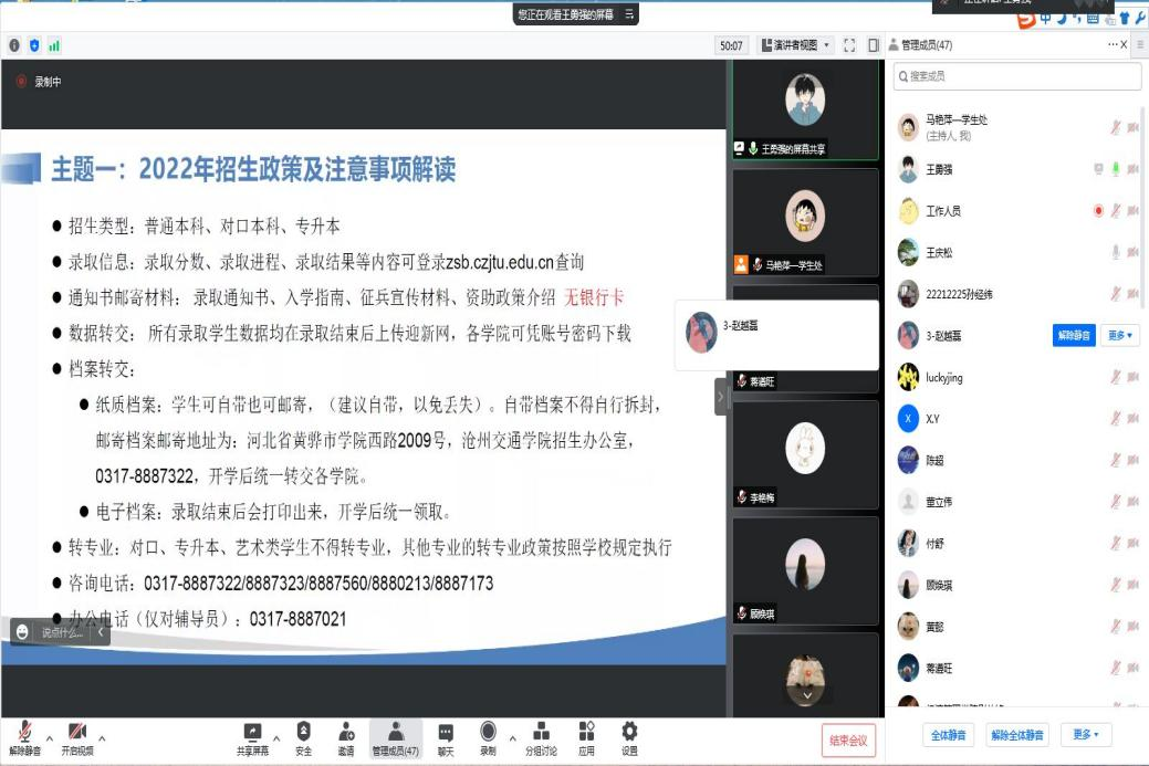 首先,由招生就业处副处长王勇强对2022年招生宣传政策及注意事项进行解读,王老师主要简述了通知书发放的进程,并对招生类型、录取信息、通知书邮寄材料、数据转交、转专业、档案转交六个方面分别进行了介绍。