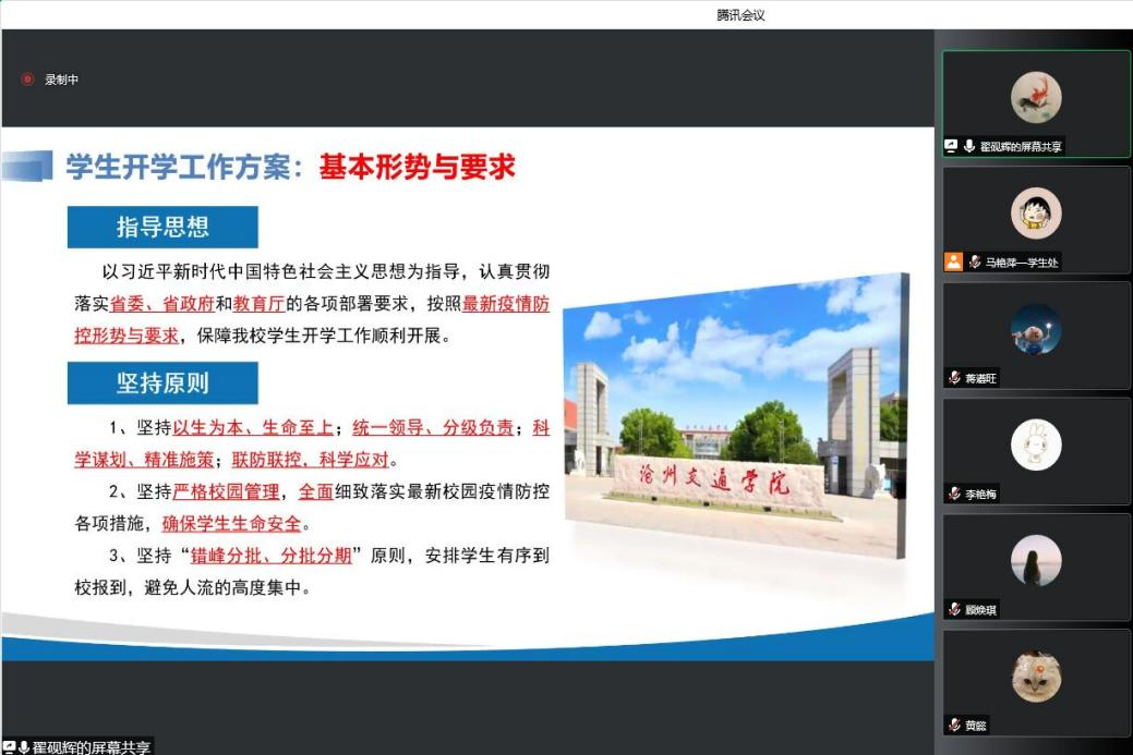 紧接着,学生处副处长翟砚辉对2021年新生报到防疫工作方案进行阐述,强调2022年学生开学工作方案要遵循最新的疫情防控形势和政策要求,就开学时间安排、 学生返(到)校、其他工作安排、开学前准备工作、学生返校后管理工作、学生到校安排和具体流程、学生报到流程七个方面进行了细致的分析与介绍。