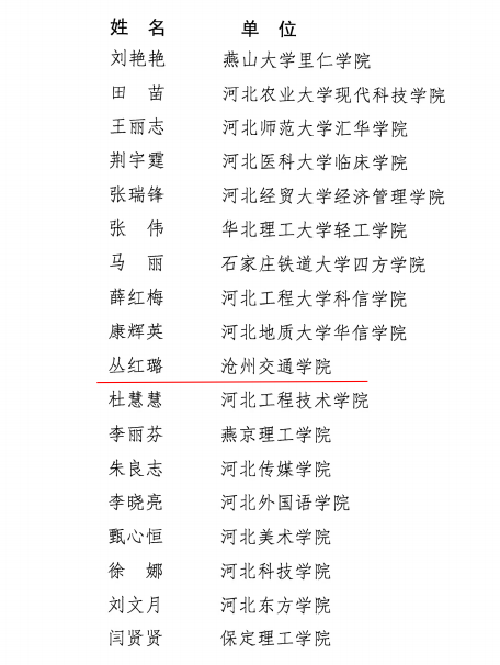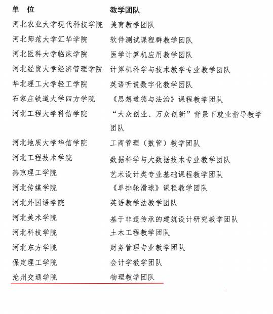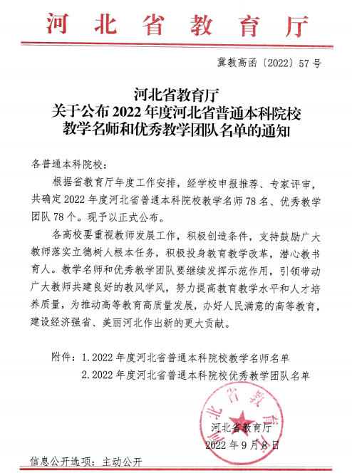 近日,河北省教育厅公布了《2022年度河北省普通本科院校教学名师和优秀教学团队名单》(冀教高函〔2022〕57号),米乐官网通识教育学院丛红璐副教授荣获2022年度河北省普通本科院校教学名师称号,其带领的“物理教学团队”荣获2022年度河北省普通本科院校优秀教学团队。
