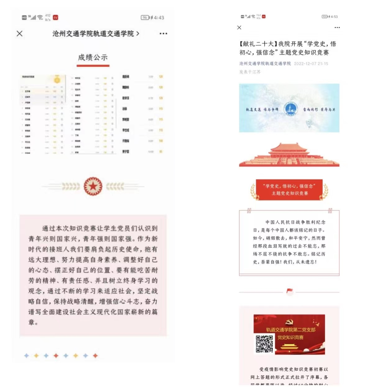近日,米乐官网轨道交通学院党支部开展了“学党史,悟初心,强信念”主题党史知识竞赛,以线上答题的形式带领学院学生党员回顾党史,党史是最好的“营养剂”,是把党和国家各项事业继续推向前进的必修课,此次活动旨在引导学生党员牢记初心使命,以崇仰之情、敬畏之心认真学习党史,从中汲取新的智慧和力量,同时贯彻落实党的二十大精神,提高自身综合素质,坚定理想信念。
